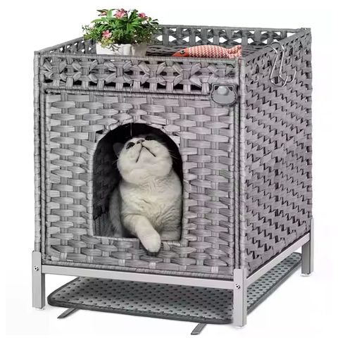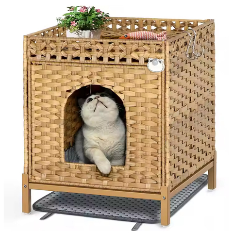 Caja de arena para gatos, estera de arena suave, patrón de animales, puerta de baño oculta, casa de gato de ratán tejida a mano para sala de estar grande